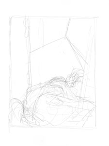 Frau im Raum (Sitzende im Cager); 1980; Maße: 38 x 28 cm; Graphik: Handzeichnung; Bleistift auf Zeichenpapier (Skizze zur gleichnamigen Radierung); dat. l.u.16.I.1980; Erbeng. Arndt - Reg. Nr.: Z80 - 20/26