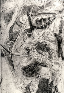 Am Galgenbaum; 1980; Maße: 14 x 11,5 cm; Druckgrafik: Radierung (Eisenaquatinta) auf "BFK RIVES France oo" Büttenpapier; Auflage: 10; 1 Platte; Druckinitiale r.u. A.; Reg. Nr.: R80 - 27/06