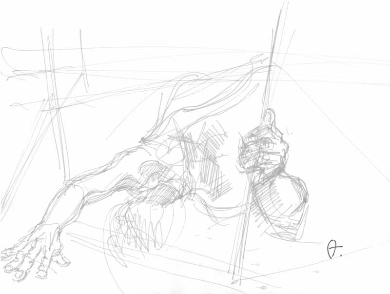Der Gestürzte (Liegender im Cager); 1981; Maße: 36 x 47 cm,Graphik: Zeichnung; Bleistift/ Tusche auf Zeichenpapier