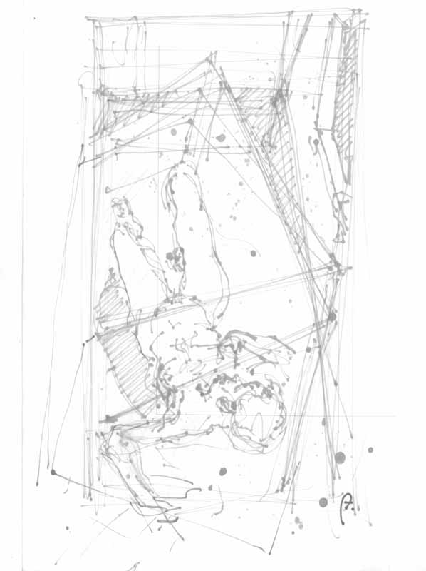 Der Gestürzte (Liegender im Cager); 1981; Maße: 41 x 27 cm,Graphik: Zeichnung; Bleistift/ Tusche auf Zeichenpapier