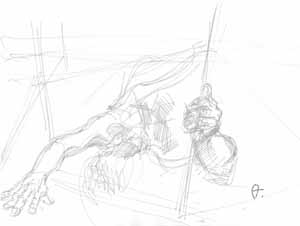 Der Gestürzte (Liegender im Cager); 1981; Maße: 36 x 47 cm, Graphik: Zeichnung; Bleistift/ Tusche auf Zeichenpapier; sign. r.u. A.; Erbeng. Arndt - Reg. Nr.: E 81 - 04/20