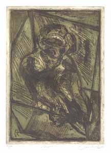 Cagerfigur in Grün; 1981; Maße: 40,5 x 29 cm, Druckgraphik: Farbradierung auf BFK RIVES FRANCE Büttenpapier; 2 Platten (Eisen), Auflage 50; Druckinitiale: A.; Reg. Nr.: R 81 - 29/11