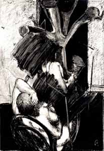 Paar im Cager; 1981; Maße: 73 x 51 cm, Graphik: Zeichnung; Tusche/Acryl auf Schoeller Hammer 4R Zeichenkarton; Erbeng. Arndt - Reg. Nr.: Z 81 - 19/04