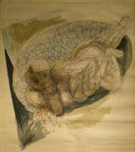 Liegende auf Rundbett; 1981; Maße: 150 x 135 cm, Graphik: Zeichnung; Tusche /Acryl auf Zeichenkarton; Erbeng. Arndt - Reg. Nr.: Z 81 - 20/33