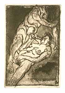 Glühende Lust; 1981; Maße: 19 x 13 cm, Druckgraphik: Farbradierung auf Büttenpapier; 2 Platten (Hoch- und Tiefdruck, Kupfer/Eisen); Auflage 50 davon 40 für Kassette Eros Reihe; Druckinitiale r.u. A. Reg. Nr.: R 81 - 27/18