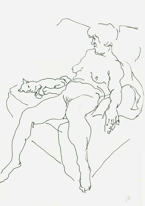 Weibl. Akt mit Katze spielend auf Sofa; 1982; Maße: 72 x 51 cm; Grafik: Handzeichnung; Tusche auf Felix Schoeller Turm Zeichenpapier