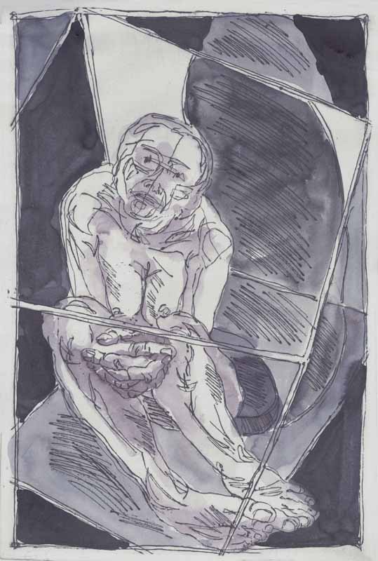Sitzende im Cager (colorierte Radierung); 1982; Maße: 51 x 34 cm; Grafik: Radierung ergänzt durch Handzeichnung;und in Tusche coloriert auf Büttenpapier