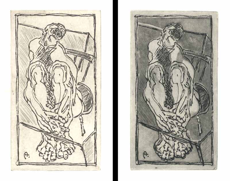 Die Vergessene Variation I und II; Reihe "Kleine Cager-Radierungen", Blatt I; 1982; Maße: 22 x 12 cm; Druckgrafik: Radierungauf "BFK RIVES France oo" Büttenpapier, 1 Druckplatte;