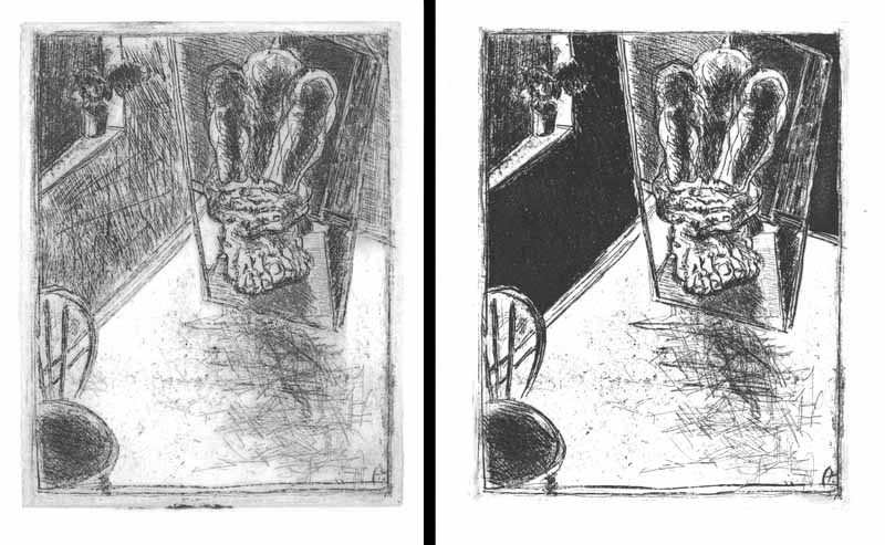 Einsamer; Variation I und II; Reihe "Kleine Cager-Radierungen", Blatt VIII; 1982; Maße: 16 x 13 cm; Druckgrafik: Radierung auf "BFK RIVES France oo" Büttenpapier; 1 Druckplatte