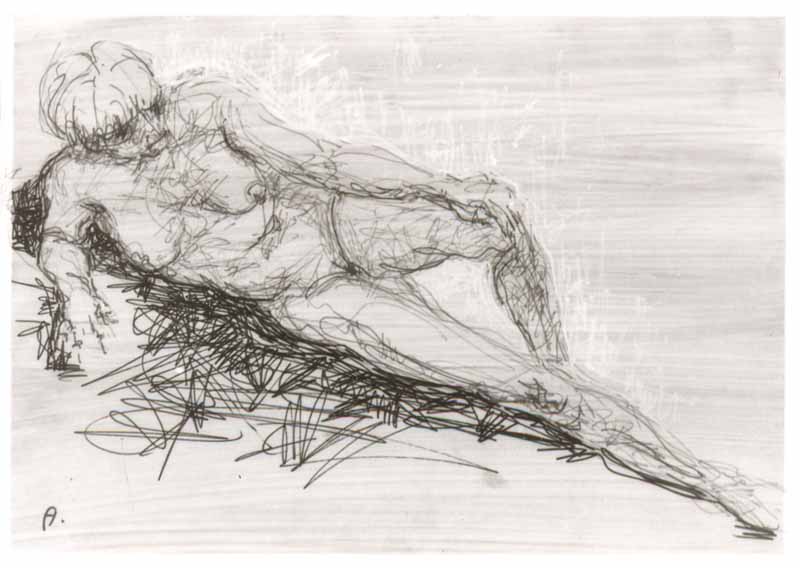 Weiblicher Akt, liegend; 1982; Maße: 40 x 57 cm; Grafik: Handzeichnung;Tusche/ Acryl auf Zeichekarton