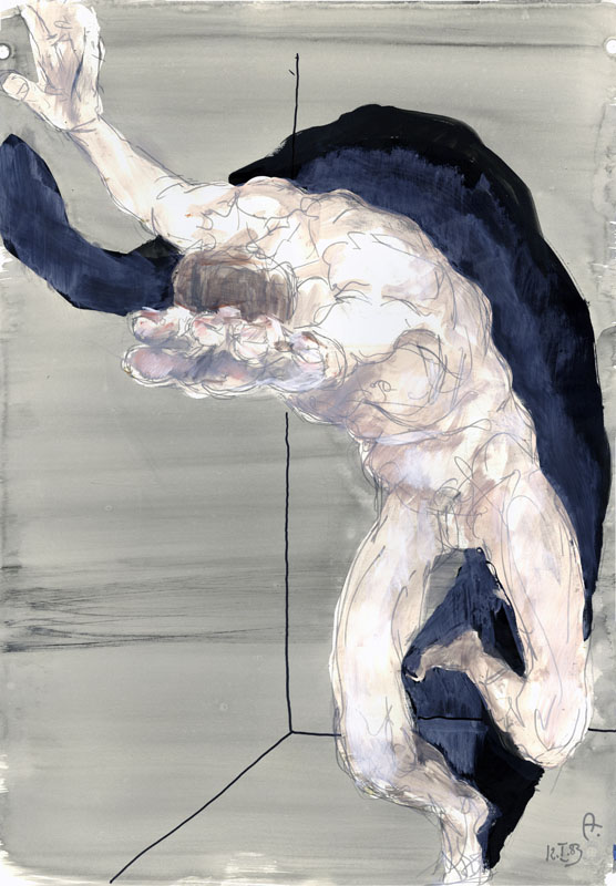 Der Aussteiger, Variation mit Schatten; 1983; Maße: 73 x 51 cm, Grafik: Handzeichnung; Tusche/ Acryl auf mit Schwamm eingefärbtem Hammer 4R Zeichenkarton