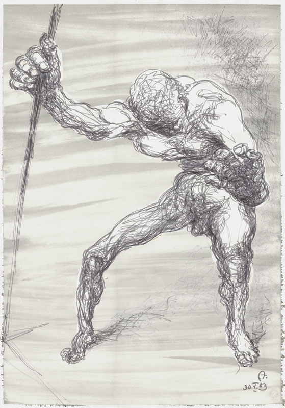 Der Aussteiger, Variation in grau; 1983; Maße: 73 x 51 cm, Grafik: Handzeichnung; Tusche/ Acryl auf mit Schwamm eingefärbtem Hammer 4R Zeichenkarton