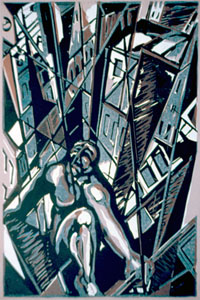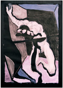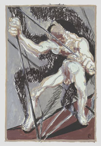 Fliehender (sich an der Wand stützend); 1983; Maße: 139 x 88 cm, Gemälde: Mischtechnik auf grundierter Tischlerplatte; Sign. u. dat. r. u. "A. 83"; Erbeng. Arndt - B83 - 28/24