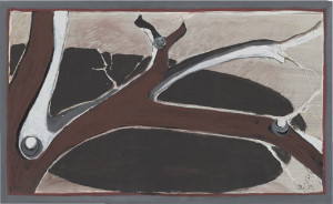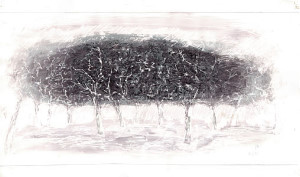 Baum vor dunklem See; 1983; Maße: 36 x 59 cm, Grafik: Handzeichnung; Tusche/ Acryl auf Zeichenkarton; Sign. u. dat. r. u. "A. 29.I.83"; Erbeng. Arndt - Z83 - 17/14
