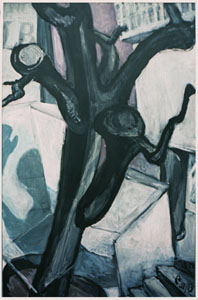 Baum in der Stadt und Schatten; 1983; Maße: 139 x 88 cm, Gemälde: Mischtechnik auf grundierter Tischlerplatte; Sign. u. dat. r. u. "A. 59/83"; Erbeng. Arndt - B83 - 28/07
