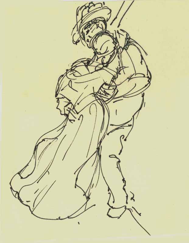 Tanzpaar; 1984, 04,5 x 10,0 cm; Grafik: Handzeichnung, Skizze zum Gemälde "Kirchweih"; Tusche auf Zeichenblockpapier