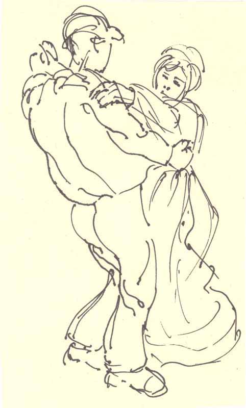 Tanzpaar; 1984, 04,5 x 08,0 cm; Grafik: Handzeichnung, Skizze zum Gemälde "Kirchweih"; Tusche auf Zeichenblockpapier