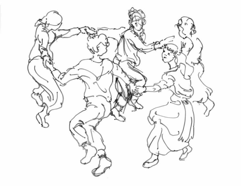 Tanz-Reigen; 1984, Maße: 15,0 x 13,5 cm; Grafik: Handzeichnung, Skizze zum Gemälde "Kirchweih"; Tusche auf Transparentpapier