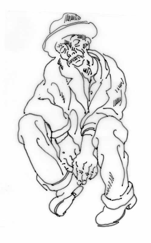 Müder Mann; 1984, Maße: 14,5 x 8,5 cm; Grafik: Handzeichnung, Skizze zum Gemälde "Kirchweih"; Tusche auf Transparentpapier