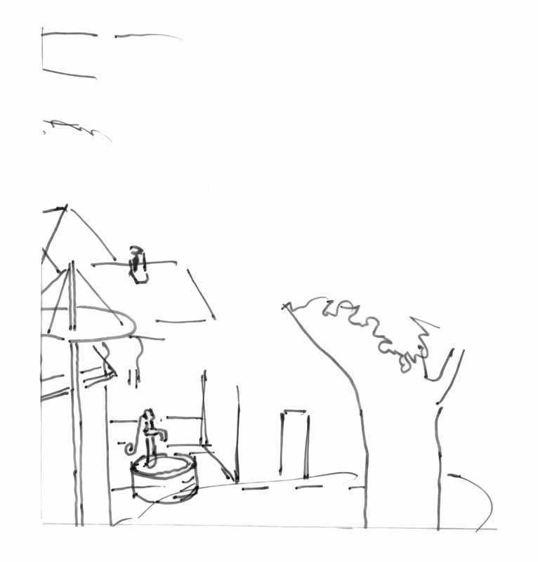 Platz mit Brunnen; 1984, Maße: 8,5 x 12,0 cm; Grafik: Handzeichnung, Skizze zum Gemälde "Kirchweih"; Tusche auf Transparentpapier