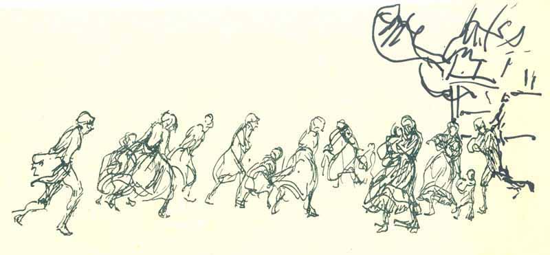 Besucher des Kirchweihfestes; 1984, Maße: 18,5 x 8,0 cm; Grafik: Handzeichnung, Skizze zum Gemälde "Kirchweih"; Tusche auf Zeichenblockpapier