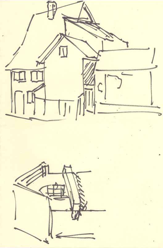 Häuser; 1984, Maße: 24,0 x 16,0 cm; Grafik: Handzeichnung, Skizze zum Gemälde "Kirchweih"; Tusche auf Zeichenblockpapier