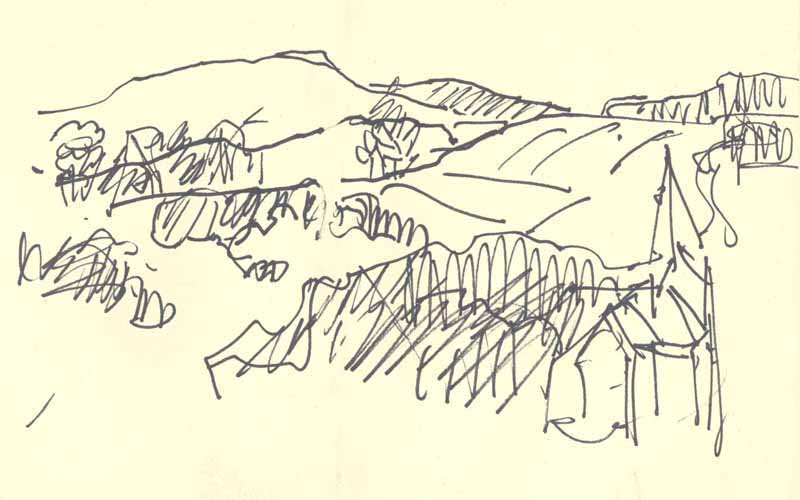 Landschaft mit Kirche; 1984, Maße: 11,0 x 20,0 cm; Grafik: Handzeichnung, Skizze zum Gemälde "Kirchweih"; Tusche auf Zeichenblockpapier