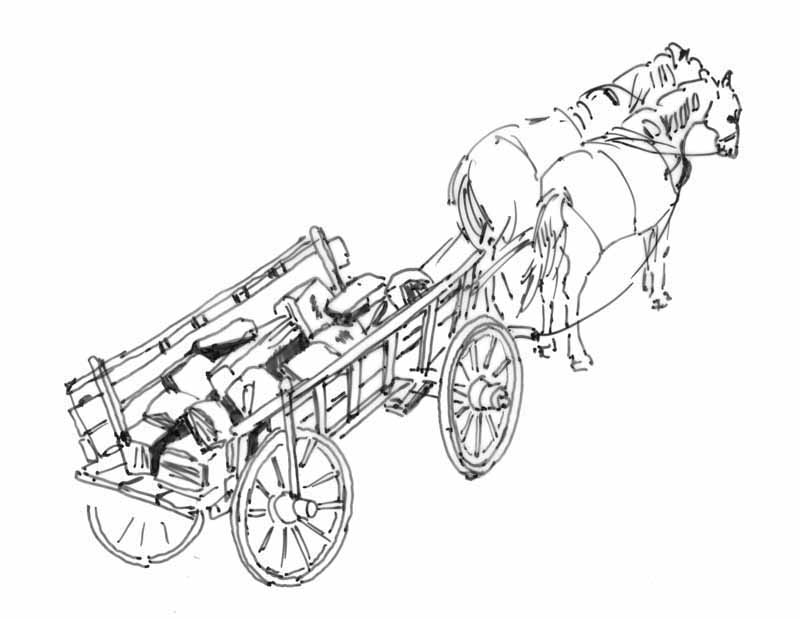 Pferdewagen mit Bruchsteine; 1984, Maße: 13,0 x 16,0 cm; Grafik: Handzeichnung, Skizze zum Gemälde "Bau der neuen Kirche"; Tusche auf Transparentpapier