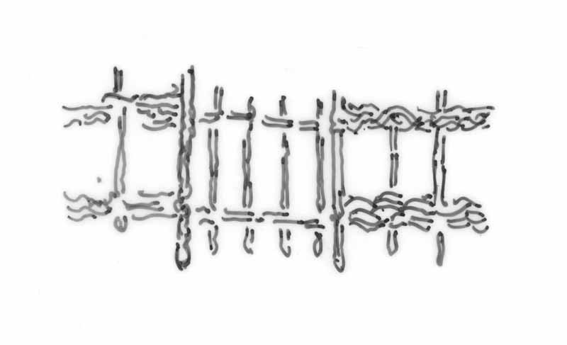 Verzierter Zaun; 1984, Maße: 4,5 x 9 cm; Grafik: Handzeichnung, Skizze zum Gemälde "Bau der neuen Kirche"; Tusche auf Transparentpapier