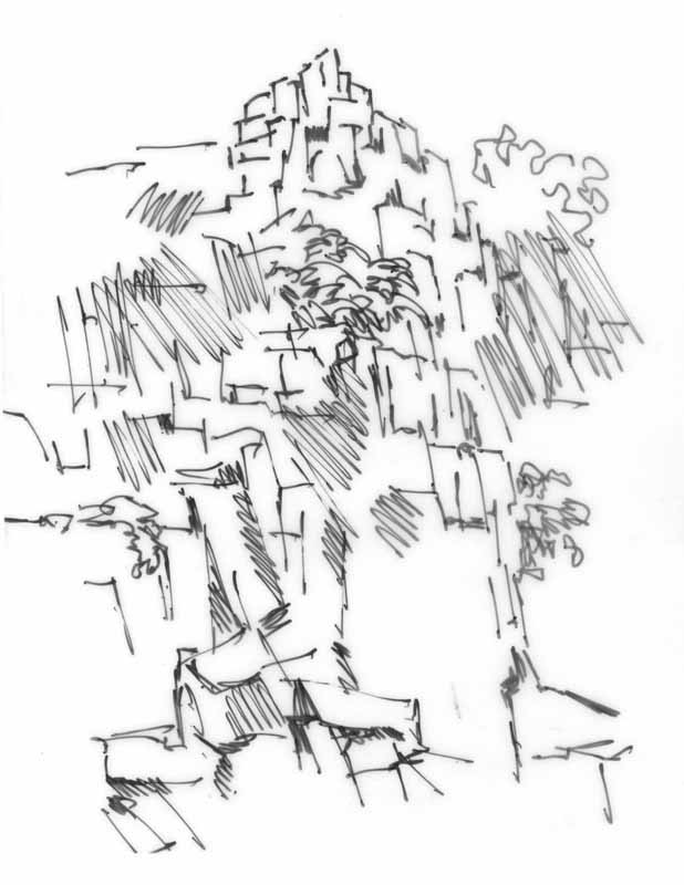 Steinbruchwand; 1984, Maße: 16,8 x 13,3 cm; Grafik: Handzeichnung, Skizze zum Gemälde "Arbeiten im Steinbruch"; Tusche Transparentpapier