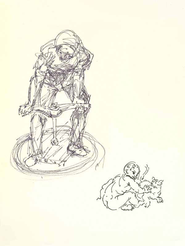 Steinbearbeitung und Kind beim Spielen mit einer Katze; 1984, Maße: 32 x 24 cm; Grafik: Handzeichnung, Skizze zum Gemälde "Arbeiten im Steinbruch", Tusche auf beigem Zeichenkarton