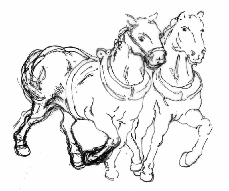 Zwei Pferde; 1984, Maße: 27,0 x 22,0 cm; Grafik: Handzeichnung, Skizze zum Gemälde "Waldarbeit"; Tusche auf Transparentpapier