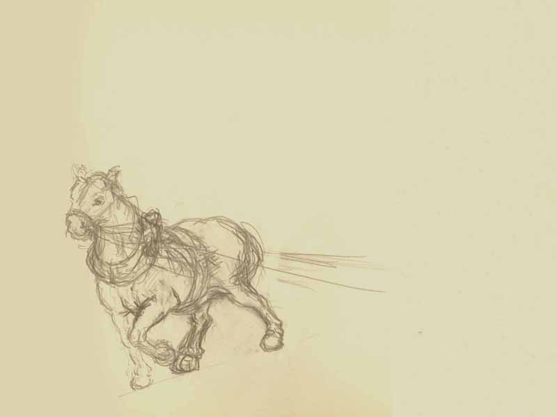 Pferd beim Arbeiten; 1984, Maße: 27,0 x 22,0 cm; Grafik: Handzeichnung, Skizze zum Gemälde "Waldarbeit"; Bleistift auf beigem Zeichenblockpapier