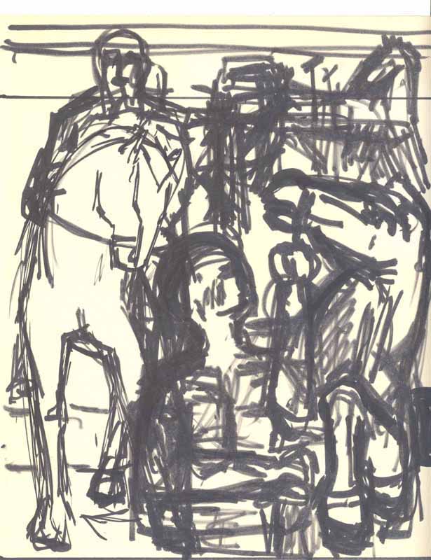 Pferdegespann; 1984, Maße: 27,0 x 22,0 cm; Grafik: Handzeichnung, Skizze zum Gemälde "Waldarbeit"; Tusche auf beigem Zeichenkarton