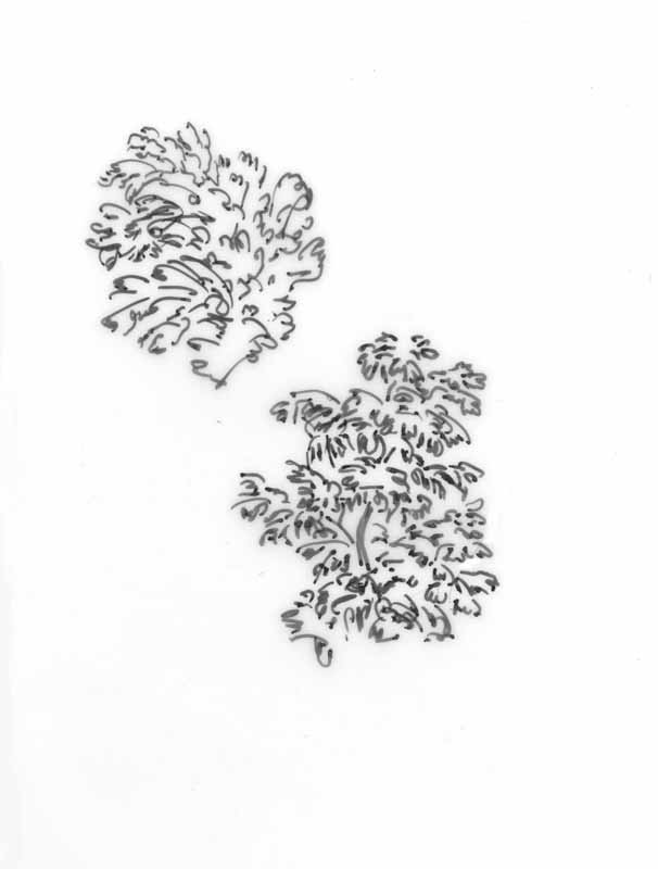 Zwei Sträucher; 1984, Maße: 9,0 x 7,0 cm; Grafik: Handzeichnung, Skizze zum Gemälde "Waldarbeit"; Tusche auf Transparentpapier