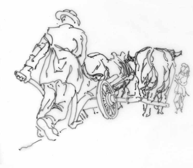 Bauer beim Pflügen; 1984, Maße: 11 x 13,5 cm; Grafik: Handzeichnung, Skizze zum Gemälde "Feldarbeit"; Tusche auf Transparentpapier