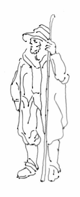Schäfer; 1984, Maße: 15,0 x 5,5 cm; Grafik: Handzeichnung, Skizze zum Gemälde "Feldarbeit"; Tusche auf Transparentpapier