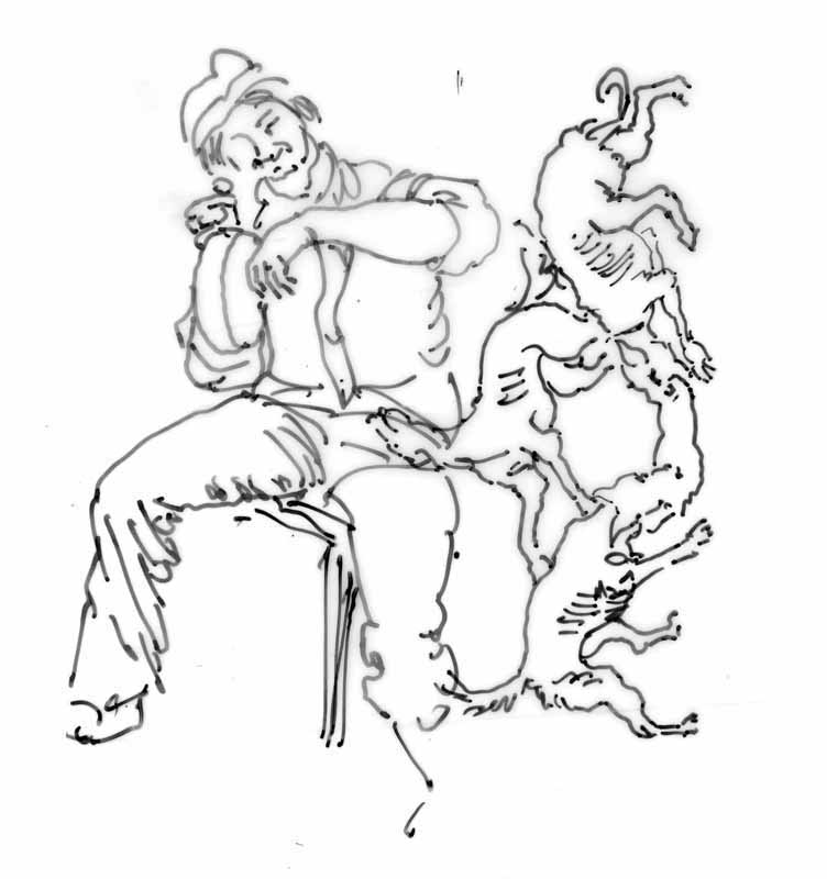 Belohnung nach getaner Arbeit; 1984, Maße: 7,5 x 7,5 cm; Grafik: Handzeichnung, Skizze zum Gemälde "Feldarbeit"; Tusche auf Transparentpapier