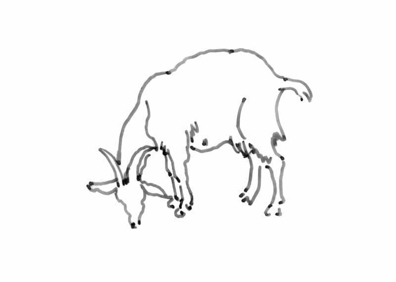 Ziege beim Weiden; 1984, Maße: 3,5 x 5,0 cm; Grafik: Handzeichnung, Skizze zum Gemälde "Feldarbeit"; Tusche auf Transparentpapier