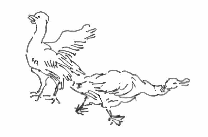 Zwei Gänse; 1984, Maße: 8,0 x 11,0 cm; Grafik: Handzeichnung, Skizze zum Gemälde "Feldarbeit"; Tusche auf Transparentpapier