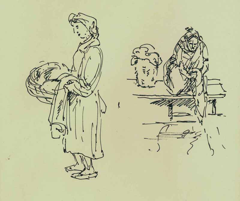 Frauen beim Waschen; 1984, Maße: 16,0 x 19,0 cm; Grafik: Handzeichnung, Skizze zum Gemälde "Feldarbeit"; Tusche auf beigem Zeichenkarton