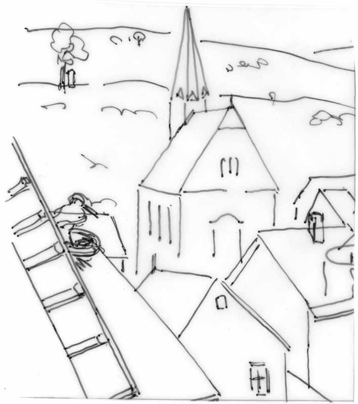 Blick auf die Kirche von Eisenbach; 1984, Maße: 14,0 x 12,5 cm; Grafik: Handzeichnung, Skizze zum Gemälde "Feldarbeit"; Tusche auf Transparentpapier