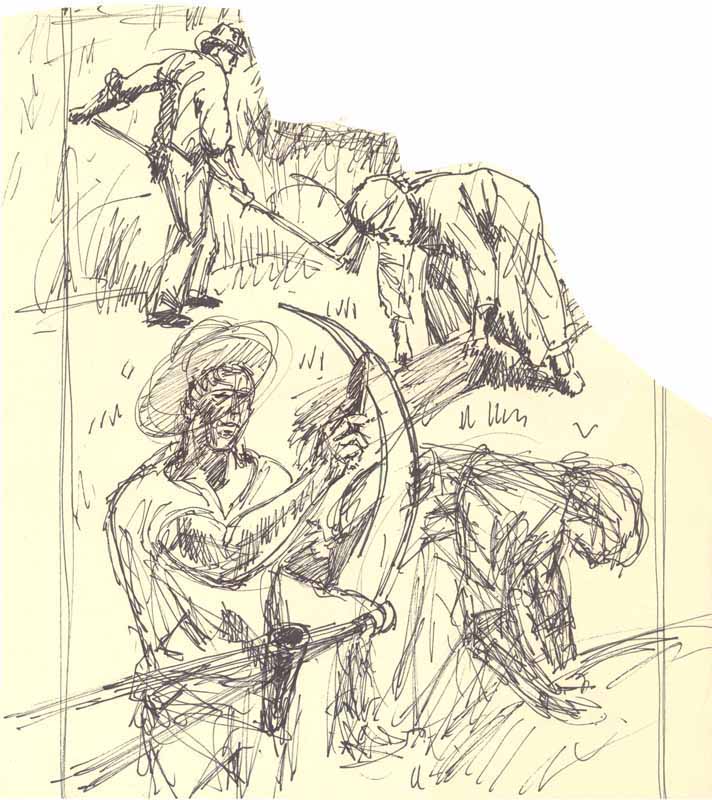 Getreideernte; 1984, Maße: 27,0 x 25,0 cm; Grafik: Handzeichnung, Skizze zum Gemälde "Feldarbeit"; Tusche auf beigem Zeichenkarton