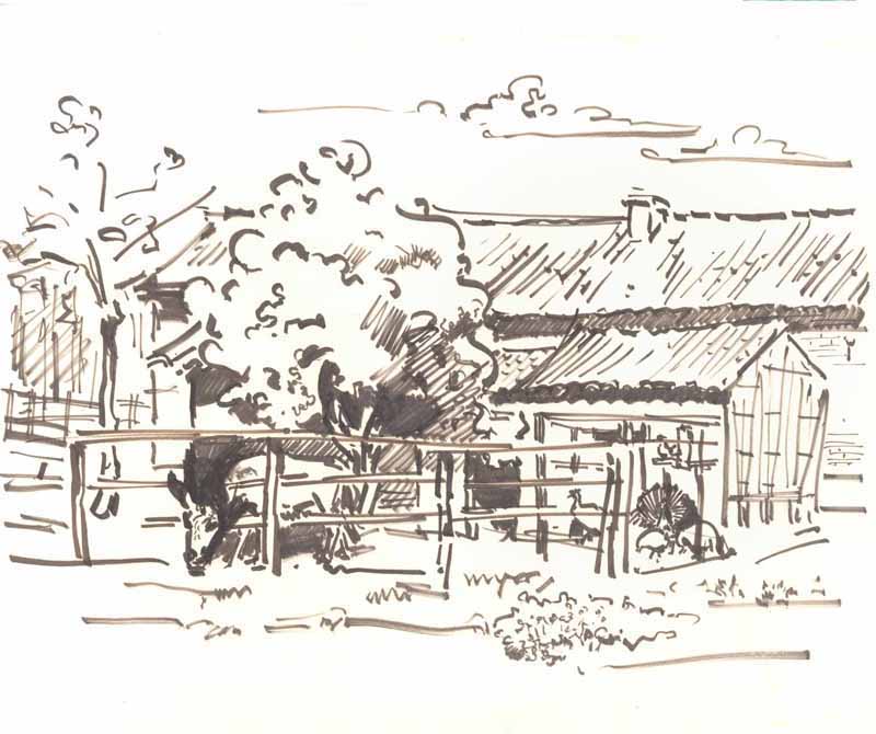 Bauernhofidylle; 1984, Maße: 27 x 37 cm; Grafik: Handzeichnung, Skizze zum Gemälde "Feldarbeit"; Tusche auf grauem Zeichenkarton