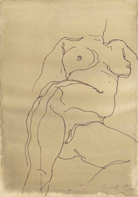 Liegender weiblicher Akt; 1984, Maße: 53 x 37 cm; Grafik: Handzeichnung, Tusche auf BFK RIVES France mit Schwamm eingefärbtem Zeichenpapier