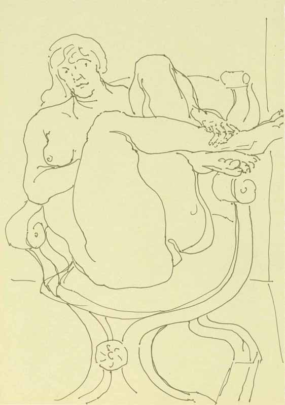 Weiblicher Akt, sitzend auf Stuhl; 1984, Maße: 30 x 21 cm; Grafik: Handzeichnung, Tusche auf grauem Zeichenkarton