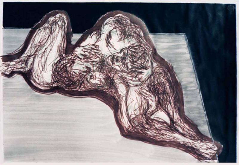 Paar auf grauem Feld vor dunklem Grund; 1985, 51 x 73 cm, Grafik: Handzeichnung, Tusche / Acryl auf "Turm"-Zeichenkarton