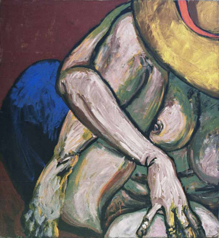 Frau mit Hut auf blauem Sofa, 1986, 134 x 122 cm, Gemälde: Mischtechnik auf Sperrholzplatte