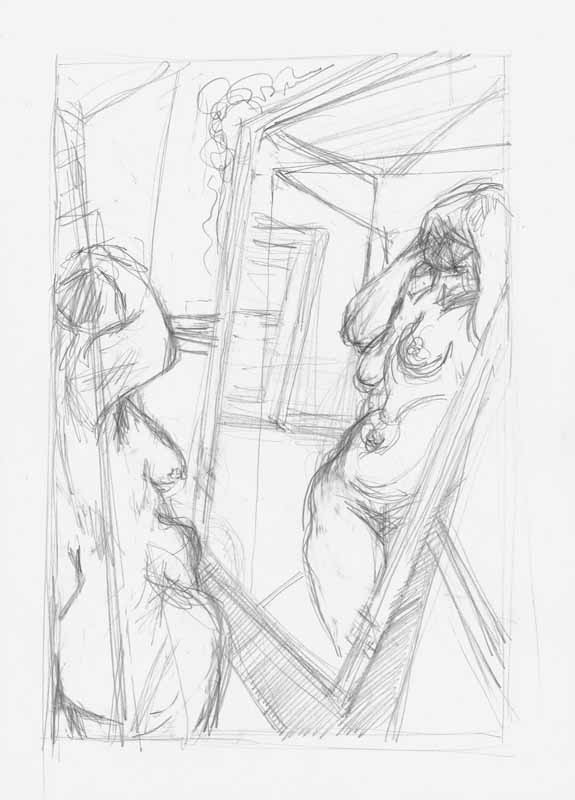 Frau vor dem Spiegel mit erhobenen Armen, 1986, 37 x 27 cm, Zeichnung: Bleistift auf beigem Zeichenpapier