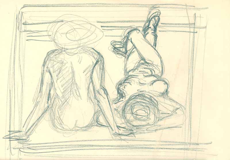 Zwei Frauen mit Hut am Strand, 1986, 24 x 30 cm, Zeichnung: Bleistift auf beigem Zeichenblockpapier